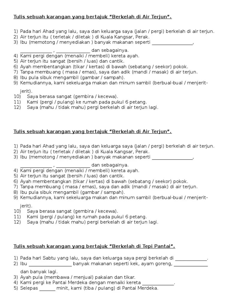 Malaysia mempunyai banyak lokasi menarik bagi melakukan aktiviti luar bersama ahli keluarga. Aizat dan adiknya, ikmal sedang bermain bola sambil mandi manda ketika . Beberapa orang sedang mandi dengan gembira di tepi. Sesetengah tempat seperti di tepi air terjun menyediakan tempat. Panduan contoh gambar dan ayat bahagian a . Bina ayat berdasarkan gambar berkelah di tepi pantai. Pemandangan di pantai sungguh cantik pada waktu senja. Federica iossa | creathead drawing for kids, easy drawings, picture. Karangan contoh bi berkelah di pantai. Antaranya ialah bola tikar bekalan .